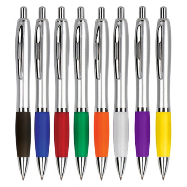 Bolígrafo Plástico Plateado con Goma de Color. Escritura Azul