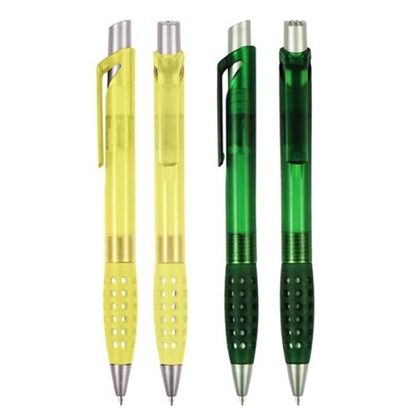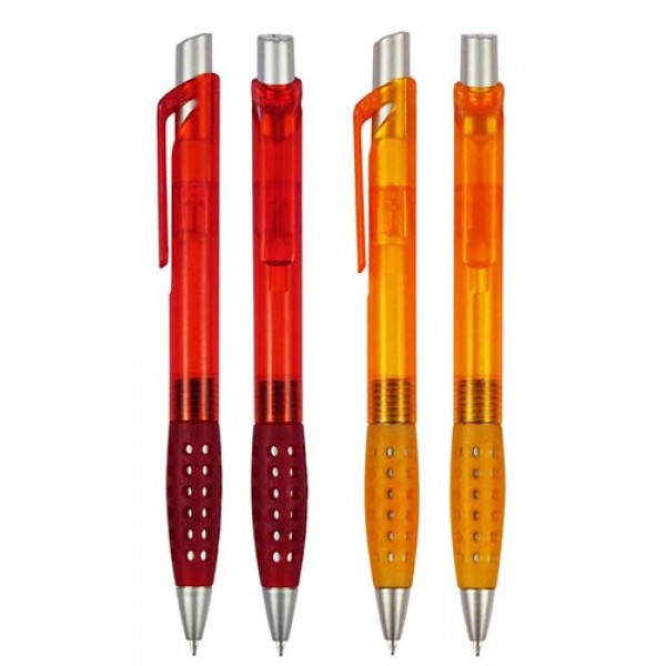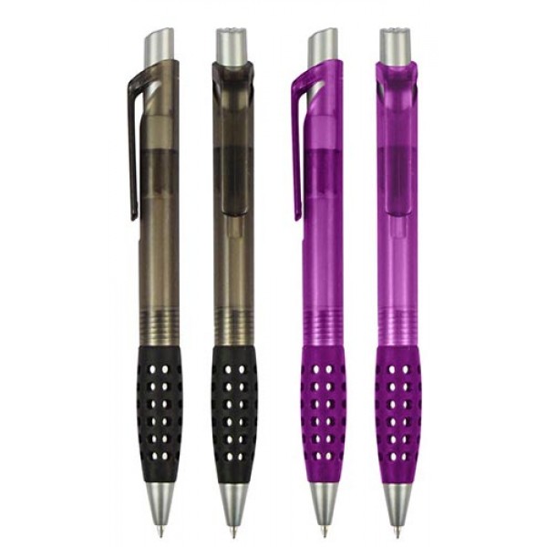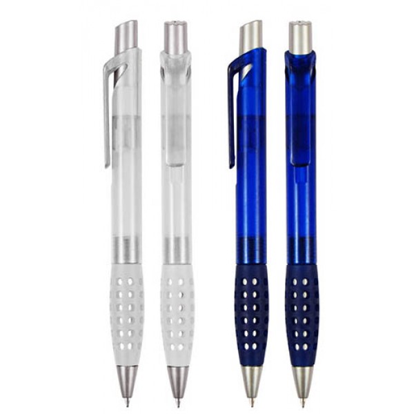 Bolígrafo Plástico con Grip de Goma con Orificios. Escritura Azul.