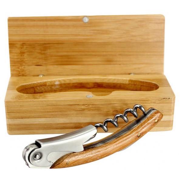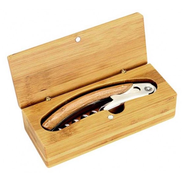 Multi - Herramientas para el Vino, en Caja Sólida 100% Madera Bamboo, con Cierre Mosquetón Envejecido. Incluye Descorchador, Destapador y Abre - Sellos.
