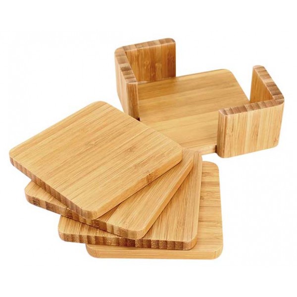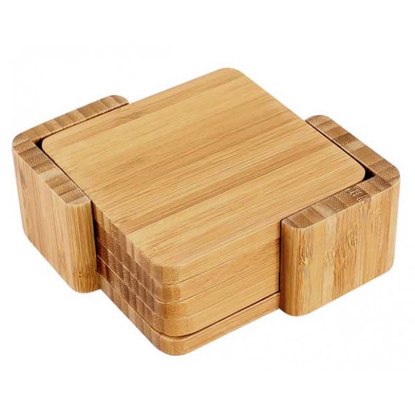 Set de 4 Posavasos Cuadrados 100% Madera Bamboo, en Contenedor 100% Madera Bamboo.