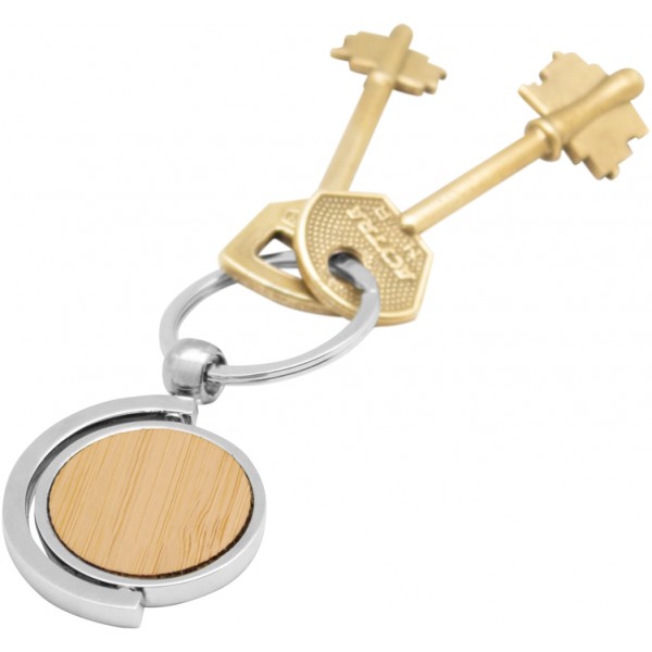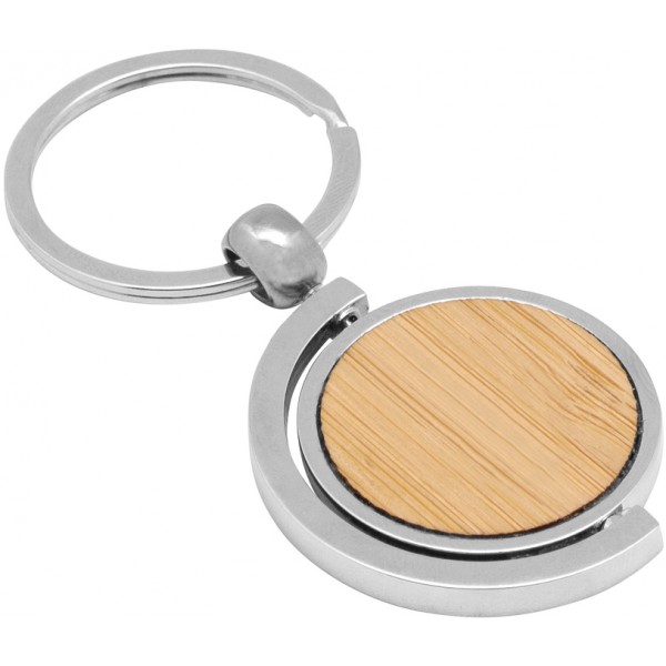 7,5 x 3,5 x 0,4 cm. Llavero circular de bambú con detalles metálicos. Estructura giratoria 360°. Presentación en caja de regalo.