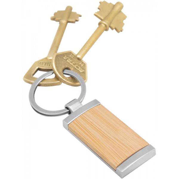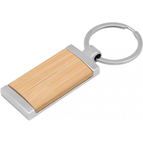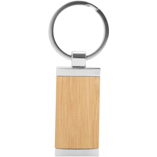 8,5 x 2,4 x 0,6 cm. Llavero rectangular de bambú con detalles metálicos. Presentación en caja de regalo.