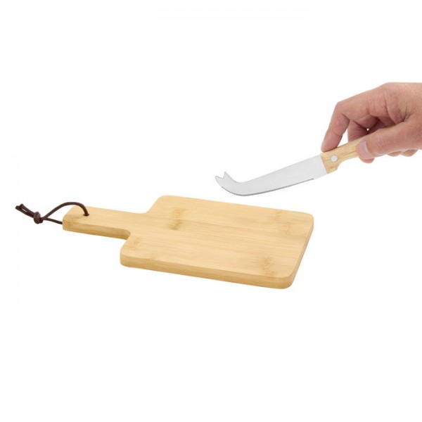 22 x 12 x 1,2 cm. Bambú + Acero inoxidable. Set de tabla de corte para quesos y cuchillo. Tabla con recubrimiento de aceite vegetal y correa en el mango. Cuchillo de 19,5 cm de largo, de acero inoxidable 420 y mango de madera . Presentación en caja de regalo kraft.