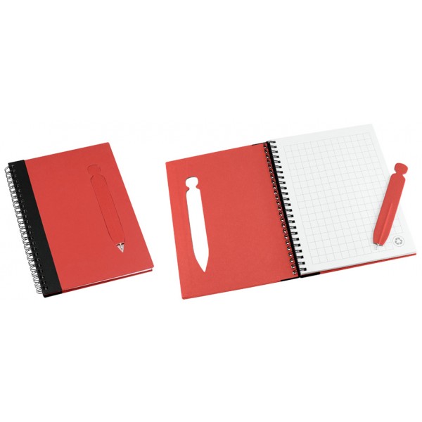 Cuaderno Ecológico con Tapas Duras de Color en Cartón Reciclado 650gsm, 70 Hojas Interiores Cuadriculadas y Anillado Metálico Doble Cero. Incluye Bolígrafo Ecológico de Cartón Troquelado, Incrustado en la Tapa.