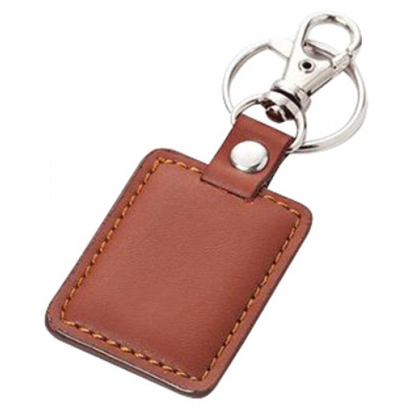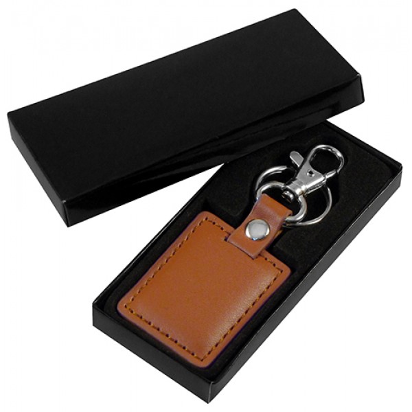 Llavero de Simil Cuero Café + Mosquetón Metálico. Presentación en Estuche Láminado Negro con Cuna Aterciopelada.