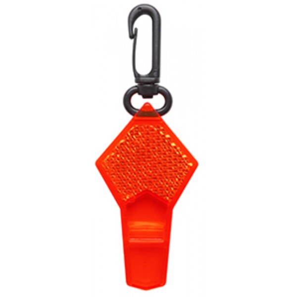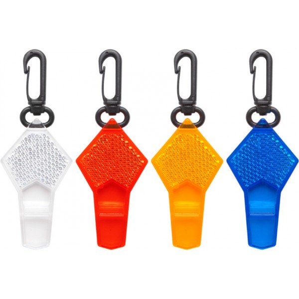 Material reflectante. Silbato transparente con formato romboide. Mosquetón color negro.