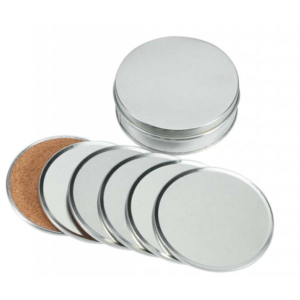 Set de 6 Posa Vasos Redondos de Aluminio con Reverso Antideslizante de Corcho. Presentación en Estuche Redondo de Aluminio.