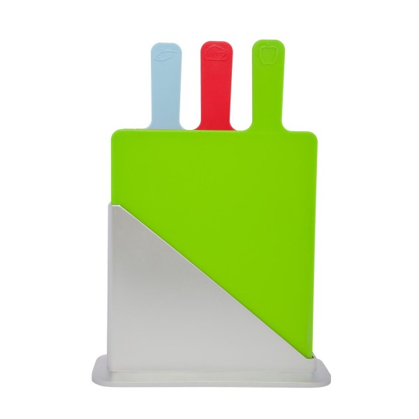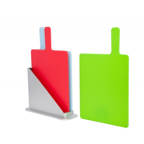 Plástico. Set de tres tablas para picar, una para cada alimento, con una base para poner las tablas y mantenerlas ordenadas.