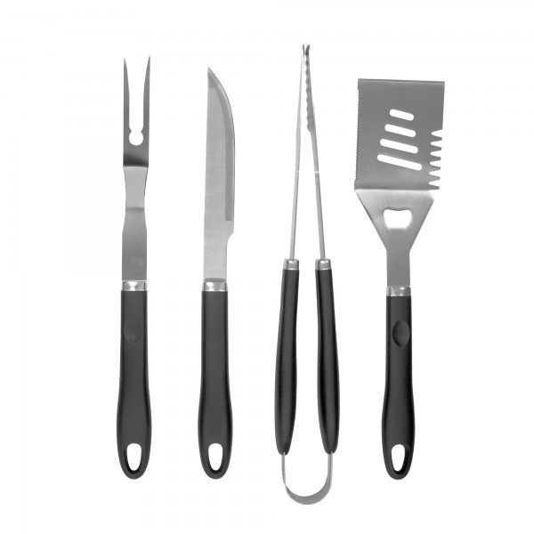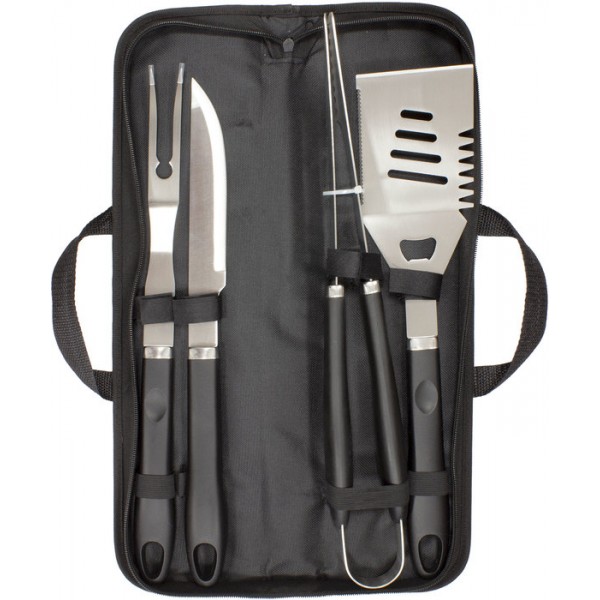 48 x 12,2 x 5,5 cm (estuche cerrado). Acero inoxidable 420. Set de 4 utensilios: tenedor y cuchillo de 41 cm, pinza de 44,5 cm y espátula de 40 cm de largo, todos con mango plástico en color negro. Estuche de nylon 600 D color negro con cierre.