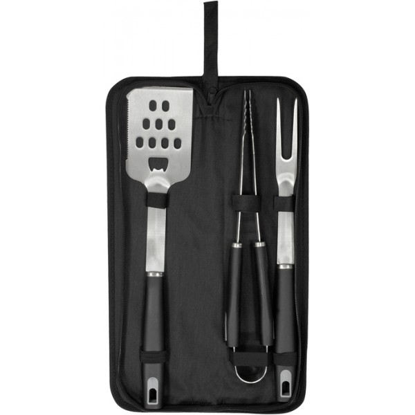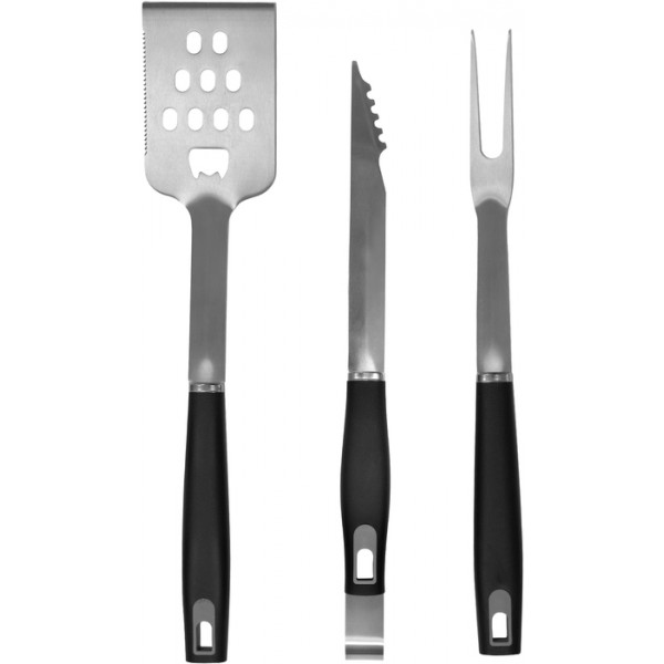 46,5 x 12 x 4,5 cm cerrado. Acero inoxidable. Set de asado en estuche color negro con cierre. Contiene 3 utensilios de acero inoxidable 420: tenedor de 135g y 41 cm de largo; pinza de 275g y 39 cm de largo; y espátula de 225g y 43 cm de largo, todos con mango de polipropileno en color negro. Espátula multipropósito (recoge, escurre, corta y destapa). Calidad premium.