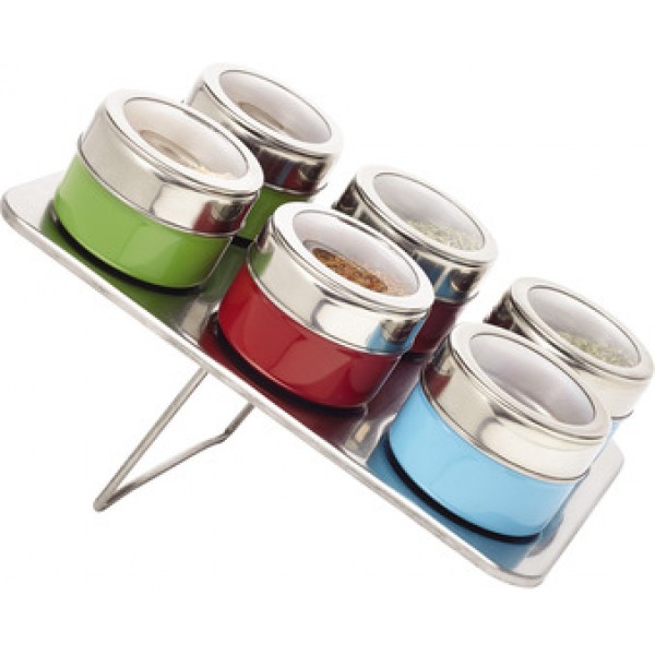 Acero inoxidable. Set de 6 Especieros imantados de color con base metálica contiene un píe que permite elevarla.