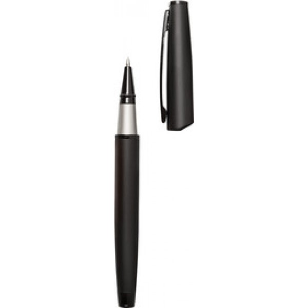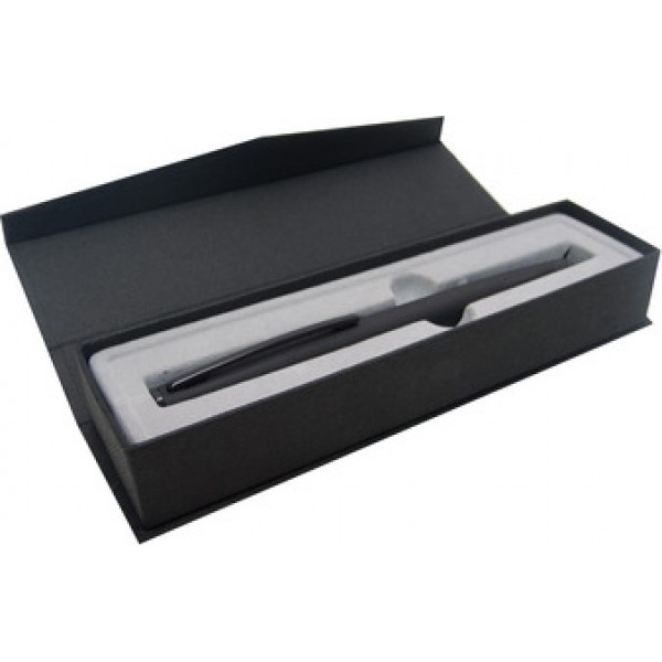 Bolígrafo Roller Metálico. Cuerpo de color negro mate. Clip con detalles en color negro brillante. Tinta Negra. Con estuche de cierre imantado.