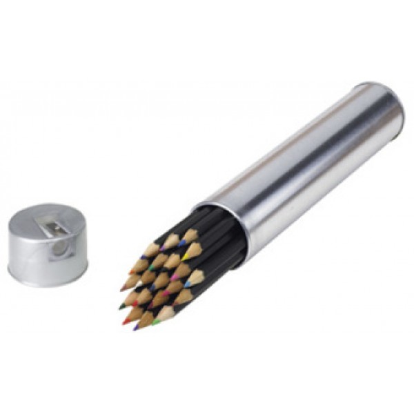 Metal. Set de lápices de colores en estuche de metal con sacapuntas.
