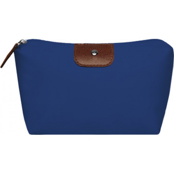 22 x 13 x 5,5 cm. Polyester. Necessaire con detalles en símil cuero y un botón metálico en el frente. Interior con forro. Tiradores de cierre de símil cuero.