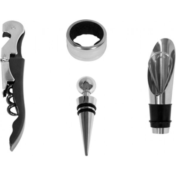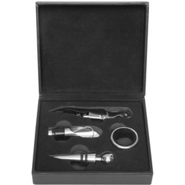 Símil cuero. Accesorios para vino en estuche de símil cuero. Cuenta con sacacorcho, argolla antigoteo, tapón y cortagotas