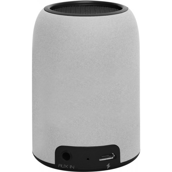 Ø 4,5 x 7 cm. (aprox). Plástico engomado. Mini parlante/bocina. En la base: goma antideslizante, interruptor de encendido y apagado, botón de reproducción/pausa, respuesta y finalización de llamada. Luz led que indica carga, conexión a bluetooth y escuchar música. Micrófono que permite realizar llamadas. En uno de sus costados entrada para audífonos/auriculares y puerto USB para su carga. Estuche con cierre en su interior un pequeño bolsillo de red. Incluye cable de carga USB y de audio.