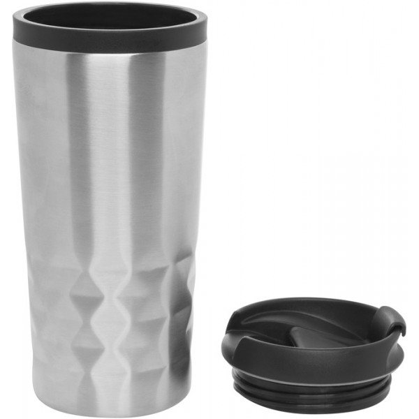 Ø 6,5 x 16 cm. Capacidad 300 ml. Metal y plástico. Mug con tapa. Exterior de metal con detalles en relieve, interior plástico. Tapa rosca en plástico. Base antideslizante.
