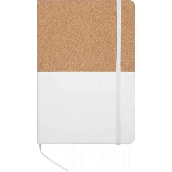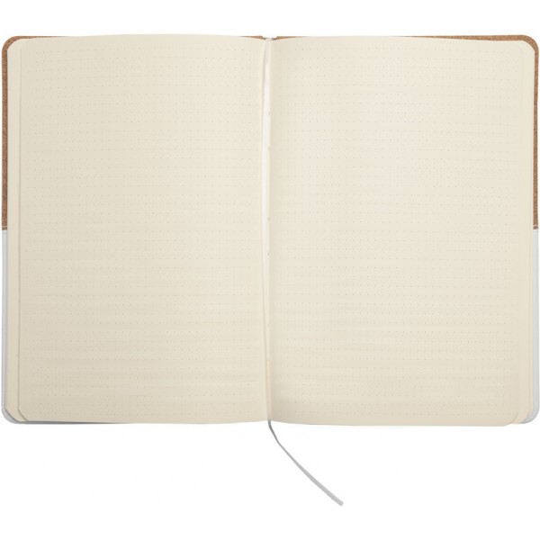 Libreta de símil corcho y PU con detalle de costura. 80 hojas con renglones punteados, señalador de tela y elástico de color que cierra o sostiene la hoja.