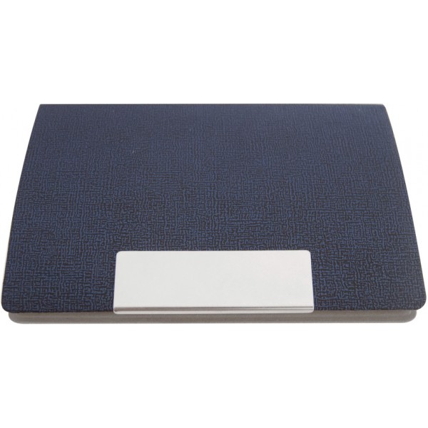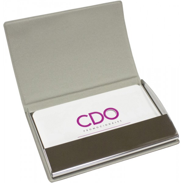 Plástico y Metálico. Exterior de vinilo texturado con amplia placa metálica para impresión. Interior en metal. Cierre imantado.