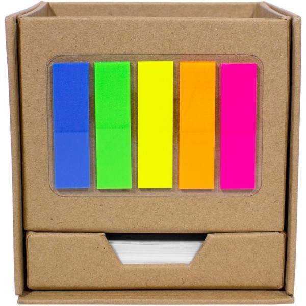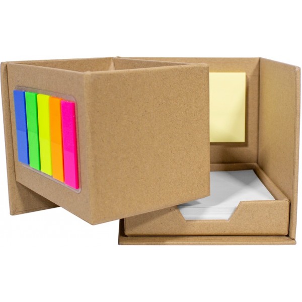 10 x 10 x 10 cm. Cartón. Porta Lápiz con post-it de tiras en diferentes colores flour en el frente, empujando hacia fuera block rectangular con autoadhesivos color amarillo y en la parte inferior un contenedor con hojas blancas de 7,4 x 8,7 cm.