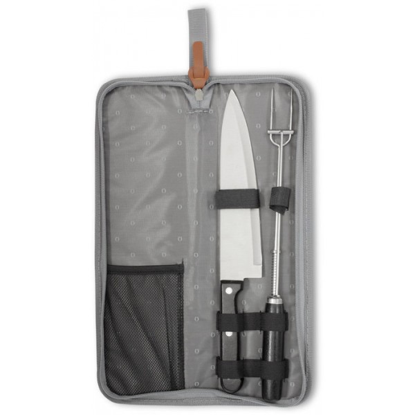 35,7 x 10,3 x 3,8 cm (estuche cerrado). Acero inoxidable 420. Set de 2 utensilios: cuchillo de 32,2 cm y tenedor con sistema de expulsión de 33 cm, ambos con mango de madera de caucho. Estuche de polyester 300D color gris con cierre. Caja de regalo.