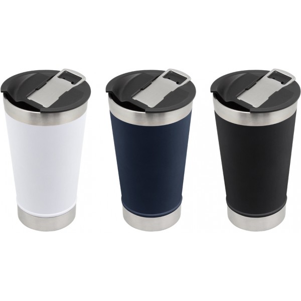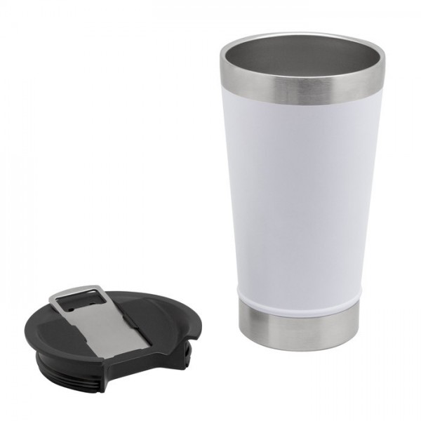 Ø 7,5 x 17 cm. Capacidad 500 ml. Acero inoxidable + Polipropileno. Mug doble pared, sellado al vacío. Interior en acero 304 y exterior en acero 201. Tapa plástica con boca ancha a presión con anillo de silicona. incluye abridor de botellas en acero inoxidable. Pintura exterior con acabado mate. Presentación en caja de regalo.