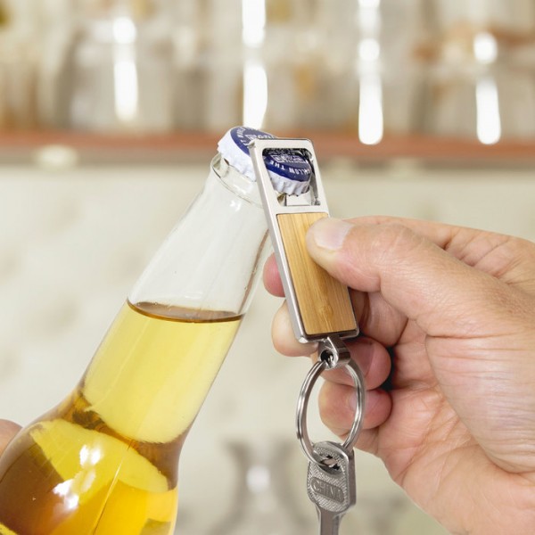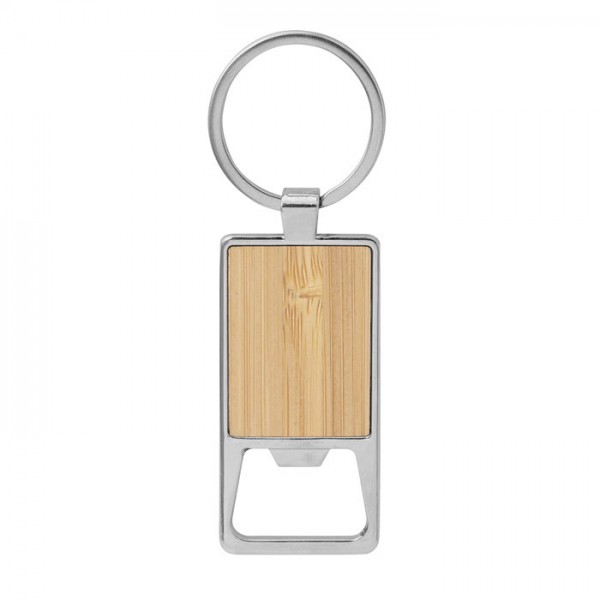 Llavero con destapador abre botellas. Estructura metálica con aleación de zinc con acabado brillante y panel frontal de bambú barnizado